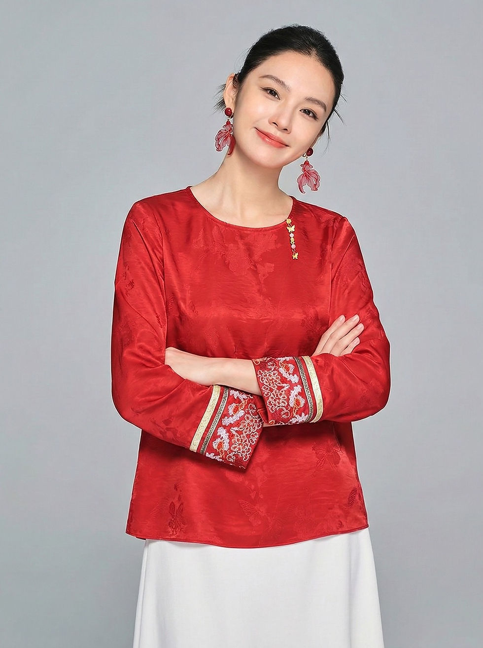 Cervotessile New Chinese Style Round Neck Embroidery Long Sleeve Top (2619)