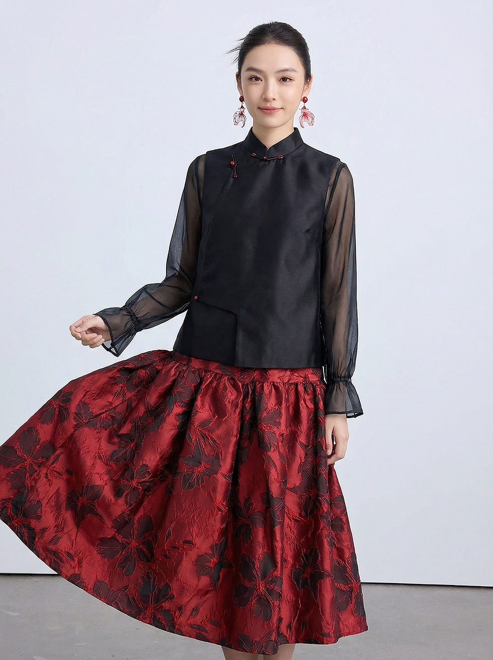 Cervotessile New Chinese Style Jacquard High Waist A-line Skirt (006)