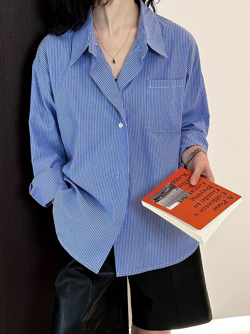 Tangerine Korean-style loose blue striped shirt